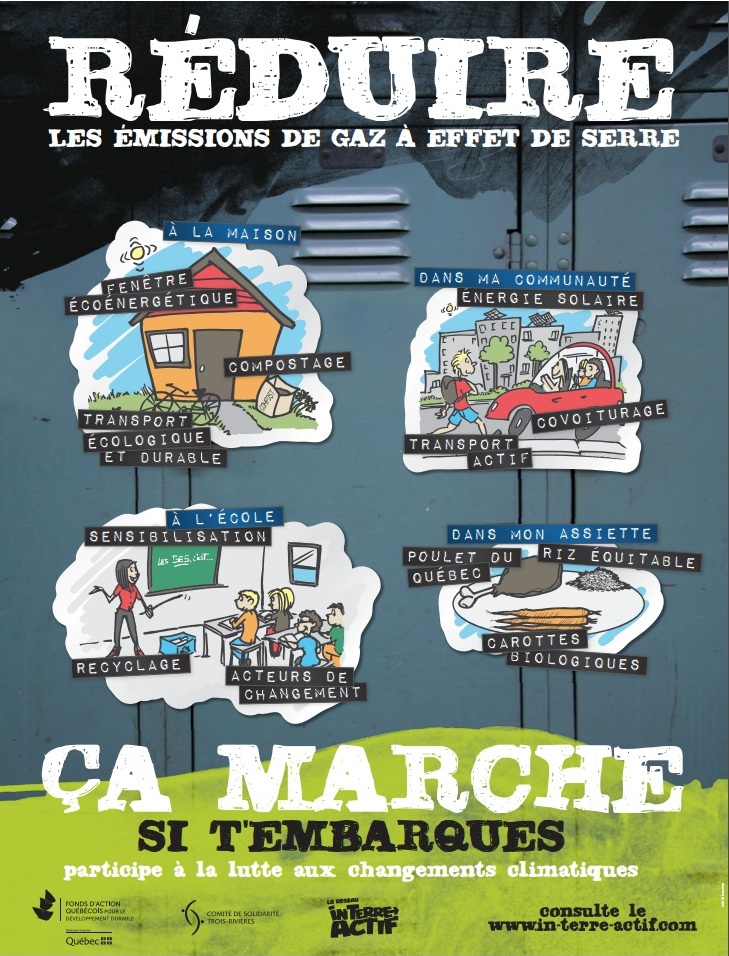 Cette affiche, développé grâce à l'appui financier du Fonds d'action québécois pour le développement durable (Fonds) et de son partenaire financier le gouvernement du Québec via son programme Action-Climat, vise à prendre conscience des multiples gestes simples à poser pour limiter nos émissions de GES au quotidien!